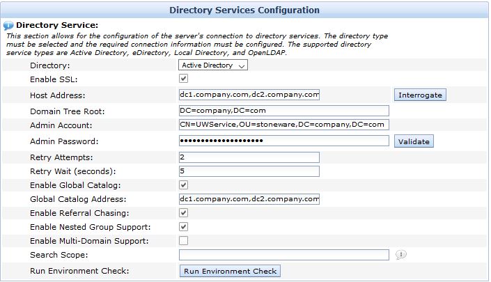 Example: dc1.company.com,dc2.company.com - Update the Global Catalog Address, if enabled, with the directory server addresses, separated by a comma.