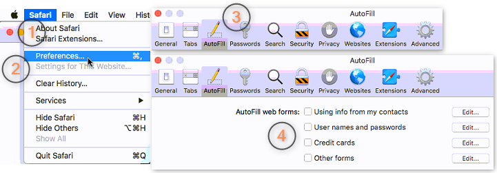 - Uncheck all of the AutoFill web forms checkboxes : Using info from my contacts, User names and passwords, Credit cards, Other forms.