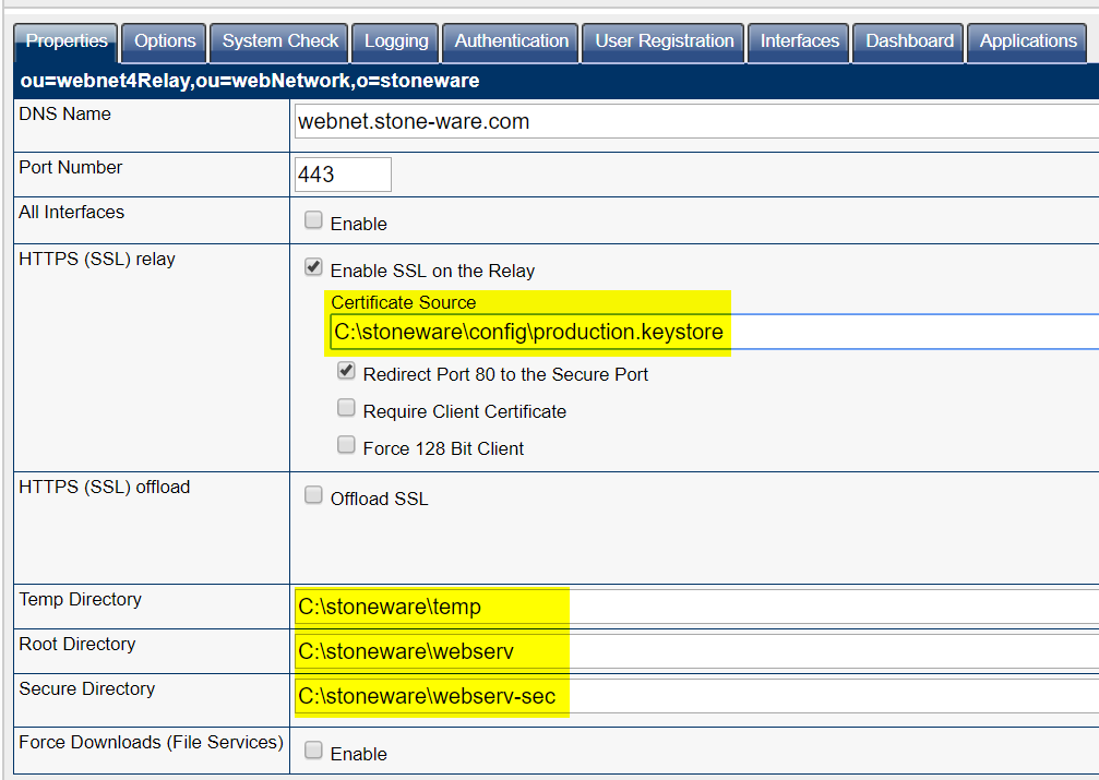 a. On the Properties tab change the HTTPS (SSL) relay path for the Keystore.