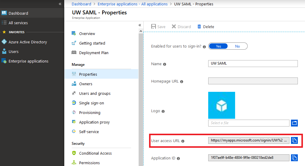 Example: https://myapps.microsoft.com/signin/UW%20SAML/1f07ae9f-b48e-4804-9f9e-080218ed2de8?tenantId=20acf201-ecd0-443b-ae08-a163f6a09925
